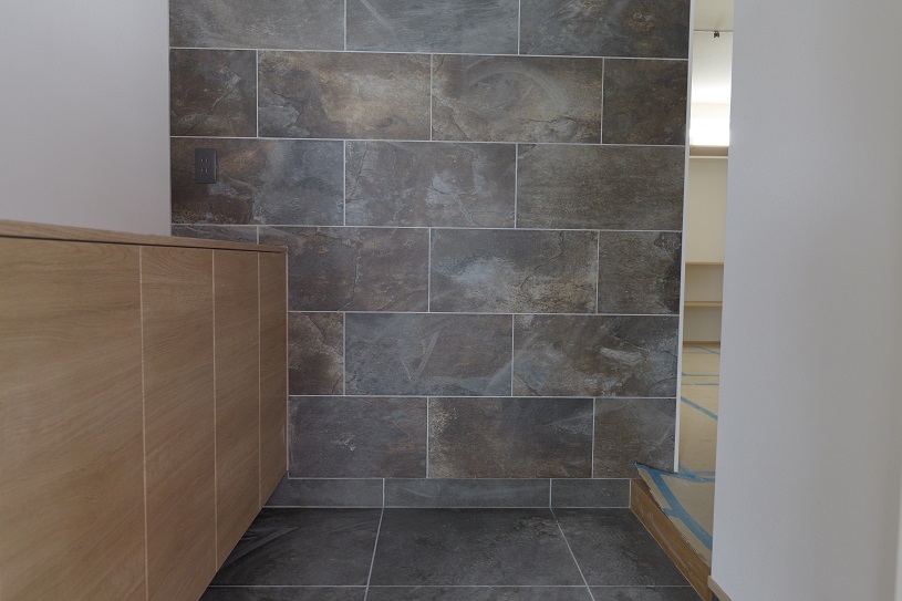 柄物の壁紙などは ほとんど採用せず、巾木も富山県産杉を使用し 仕上げ材のアクセントとして本物のタイルや無垢羽目板材張りで仕上げられた質感ある空間の建物となっております。
