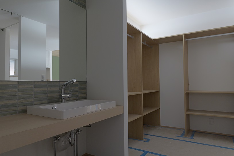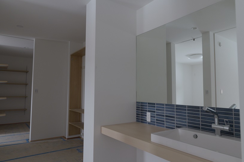 クローゼット収納は家事動線経路上にすべてあります(2階洗面室 兼 支度室)2階もひのき(檜)カウンターを採用しております。こちらはタイルの青が生え清潔感ある空間ですね。