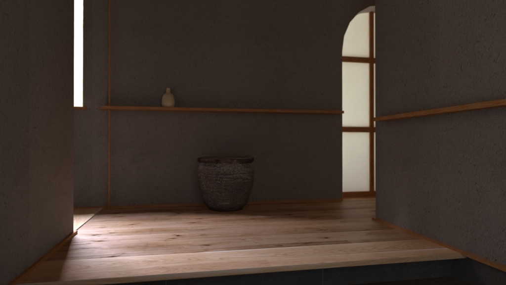本格的な茶室用躙り口となると さすがに使い勝手が悪いので、建具高さを1600mmとしRを描く様な出入口となっている建物です